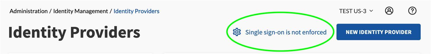 4. Enable SSO enforcement. After an IdP has been set up in Flexera One, click the Single sign-on is not enforced settings option in the upper-right corner of the Identity Providers screen to enable SSO enforcement.