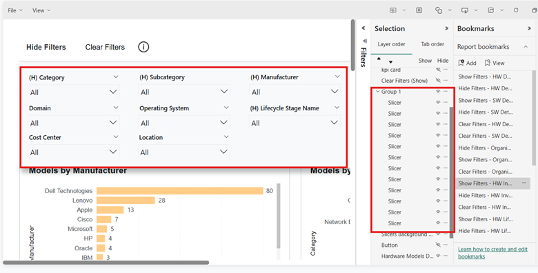 - Hide the respective slicers, text box, and Hide filters button and enable the Show Filters button. Then select the slicer group and update the respective Hide Filter Bookmark similar to Show filter bookmark.