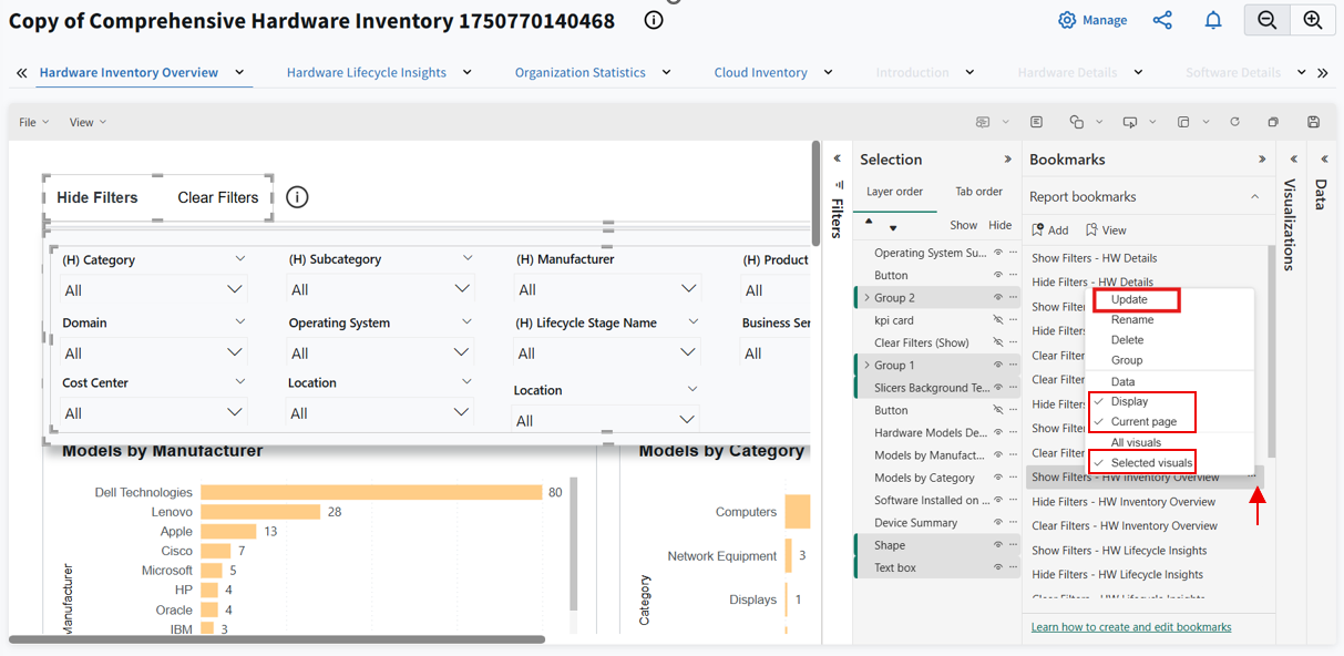 - Apply the same steps for creating new bookmarks for Hide/Clear Filter and follow the Updating the bookmark to update.