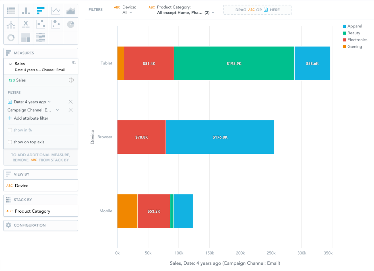 • Stack the chart by attribute or date. To add an attribute or date to the Stack by section, you must have only a single item in the Measures section. If you have multiple measures in the Measures section, you can stack the measures. For details, see Stack Measures.