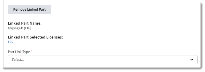 Click Select. The slideout closes, and the name and licenses of the selected part are displayed in the Linked Part Name and Linked Part Selected Licenses fields on the Create SBOM Part or Edit SBOM Part slideout. (These fields along with Part Link Type field are available only after you have selected a part on the Select SBOM Part slideout.)